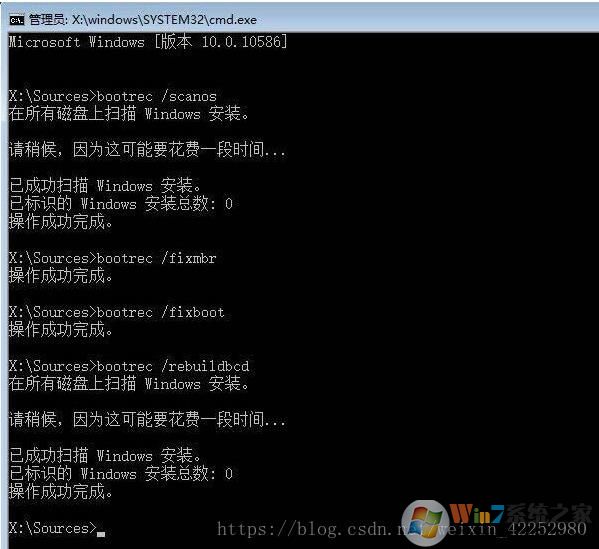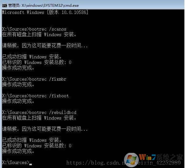 此时不要继续输入bootrec /rebuildbcd 命令,否则会再次出现输入bootrec /fixboot 命令时会出现”拒绝访问“的情况,bcd文件仍然没有得到修复