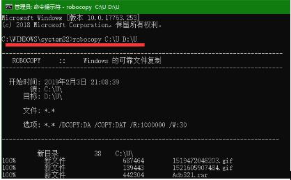 2.    在命令提示行窗口中输入“robocopy[空格][源文件夹][空格][目标文件夹]”即可从源文件夹复制文件到目标文件夹: