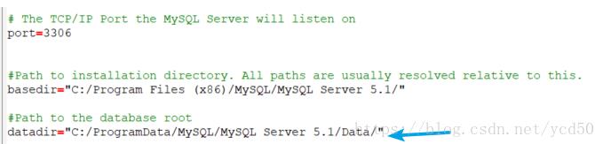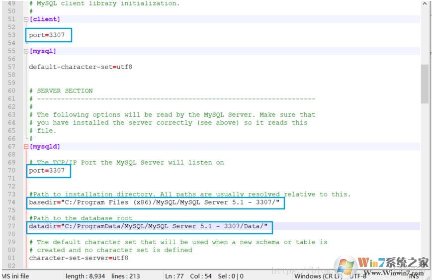 修改C:\Program Files (x86)\MySQL\MySQL Server 5.1 - 3307下的my.ini文件:启动端口改为3307;数据存储路径改为上一步骤对应的路径:C:\ProgramData\MySQL\MySQL Server 5.1 - 3307\data;根路径basedir