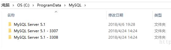 3、打开C:/ProgramData/MySQL/MySQL Server 5.1,将MySQL Server 5.1复制两份,然后重命名3307 3308,小编以端口号为识别标志。