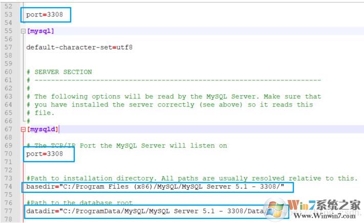 5、C:\Program Files (x86)\MySQL\MySQL Server 5.1 - 3307下的my.ini文件也做一样的修改:修改启动端口位3308;数据存储路径改为上一步骤对应的路径:C:\ProgramData\MySQL\MySQL Server 5.1 - 3308\data;根路径basedir