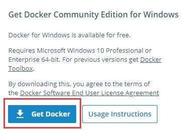 Docker下载地址为:https://store.docker.com/editions/community/docker-ce-desktop-windows  打开网页之后点击如图 Get docker处即可下载安装包: