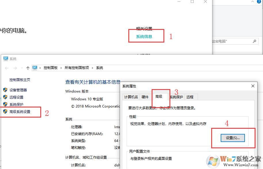 2、然后打开系统信息,找到高级系统设置 -> 高级 -> 设置
