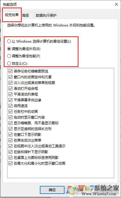 3、点击上一步的设置之后,在弹出的小窗中修改外观配置,可以自定义勾选,也可以使用快捷设置(调整为最佳外观),修改完之后点击应用,电脑有可能会卡一下稍等就好