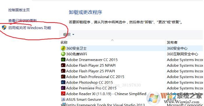 2、然后进去之后点击左上角——>启用或关闭Windows功能