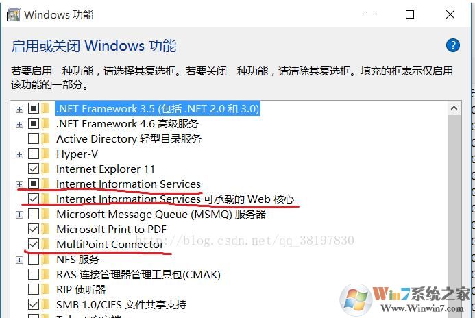 3、选中Internet Information Services、Internet Information Services 可承载的Web核心和MultiPoint Connector,最后确定即可