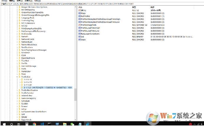 在它下面的几个子项中逐一查看名为“ProfileImagePath”的字符串值,直到找到数值数据为原中文名路径的项目;将其修改为更名后的路径就行了。