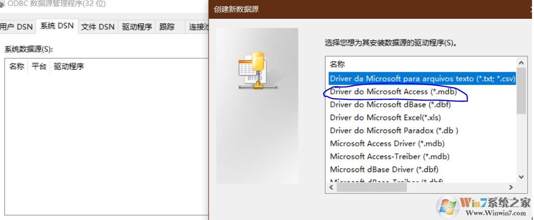2、系统DSN中,点击添加,然后创建新新数据源里,选择Driver do Microsoft Access(*.mdb)如下图;