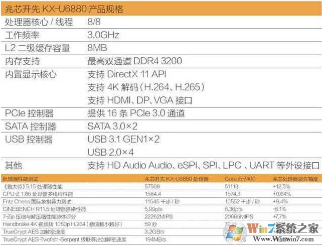 上年国内媒体微型计算机就对KX-6000系列的KX-U6880做了简单的评测,综合多项测试,KX-U6880在多核性能上稍微领先了i5-7400,虽然KX-U6880是8核,i5-7400是4核,8打4,但这对于国产处理器来说也算是可喜的进步,不仅可以日常办公使用,加上独显还能玩玩3A大作。
