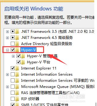 3、在启用windows或关闭windows功能中,取消勾选“Hyper-V”,然后确定保存。