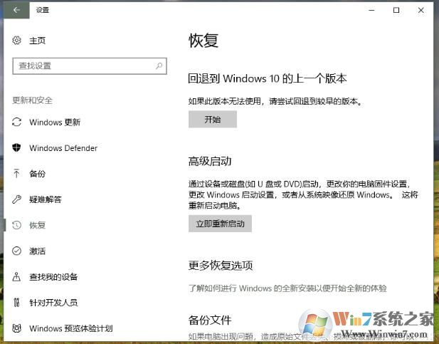 2、点击“恢复”,在右边出现栏目中“高级启动”标签下有一个按钮“立即重新启动”,点击它。
