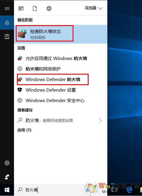 1、在Win10任务栏、搜索框内输入防火墙,就可以出现多个条目,我们选择下面红框所圈的项目; 检查防火墙状态和Windows defender打开都是一样的。