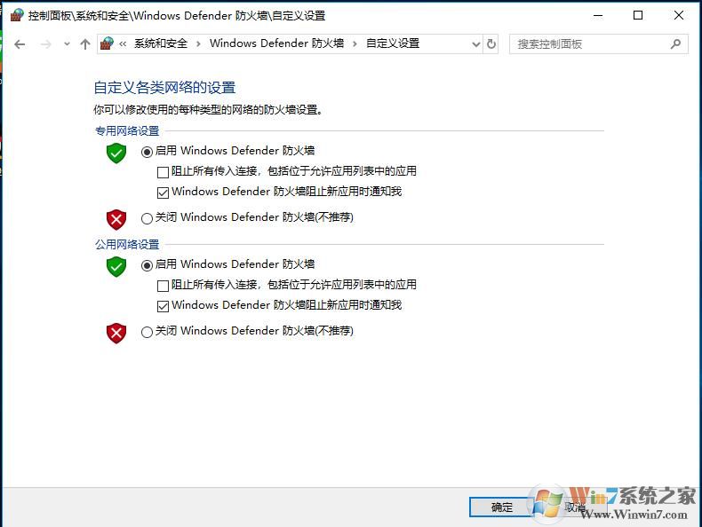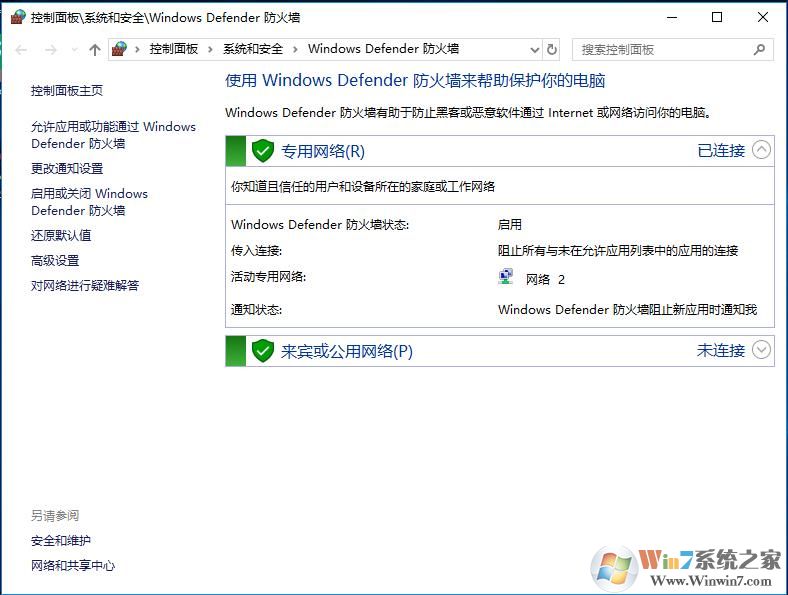 3、接下来选择启用windows defender防火墙;