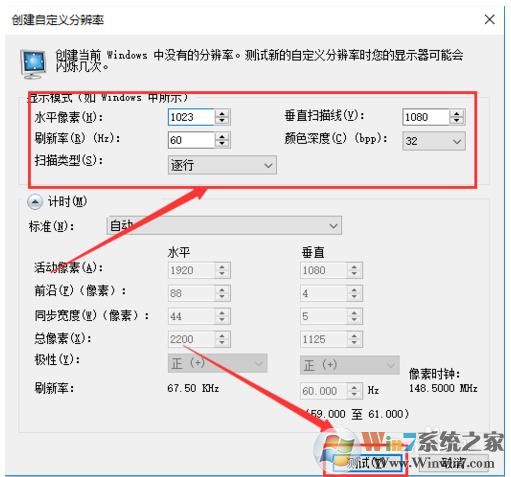 第七步,输入自定义分辨率的参数,请严格设置,不要超出显示器的范围,然后点击一下测试看分辨率是否支持。