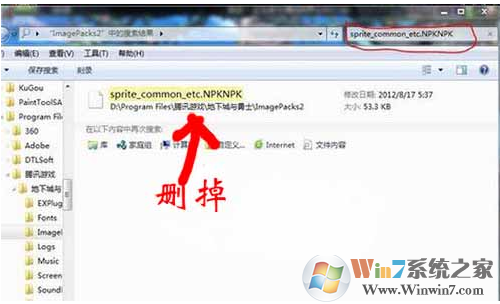 2、然后我们打开地下城与勇士的文件夹里的imagepacks2文件夹,并用win自带的搜索输入上面新下载的或者备份的文件名来搜索,搜索出来后直接删除就成功了,如下图。