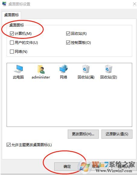 3、在桌面图标设定对话框,人们把电子计算机前边的勾勾上就能够,然后点击确认,如图: