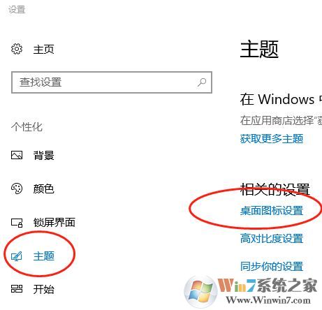2、在人性化对话框,挑选左边的导航条中的主题风格,随后挑选有关设定中的桌面图标设定,如图: