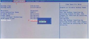 进入BIOS里面后,在BIOS 设置程序中,打开Configuration(配置)菜单,然后将HotKey Mode (热键模式)的设置从Enabled (启用)改变为Disabled (停用)。