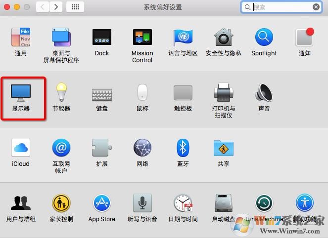 2、进入系统偏好设置界面,选择第二行中的第一项“显示器”。