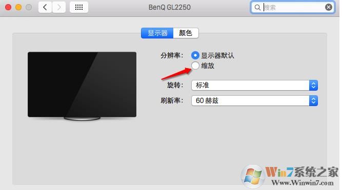 3、进入显示器界面,当前的分辨率显示的是系统默认的分辨率,选择“缩放”。
