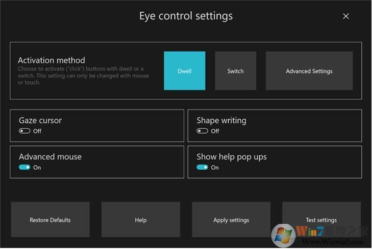 显示眼球控制设置:你可以选择激活方法,并启用注视光标,形状书写,高级鼠标和显示帮助弹出窗口等。