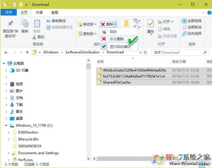 接下来,在文件资源管理器中定位到分发文件夹“C:\Windows\SoftwareDistribution\Download”,全选该文件夹下的所有文件夹,然后按下Shift+Del组合键(或从功能面板选择永久删除命令),执行永久删除操作(图4)。