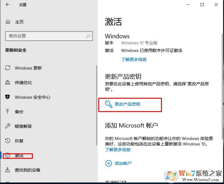 2、点击激活,然后在右侧点击【更改产品密钥】;