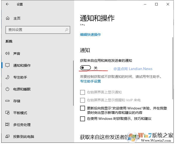 3、找到通知和操作-获取来自应用和其他发送者的通知-关