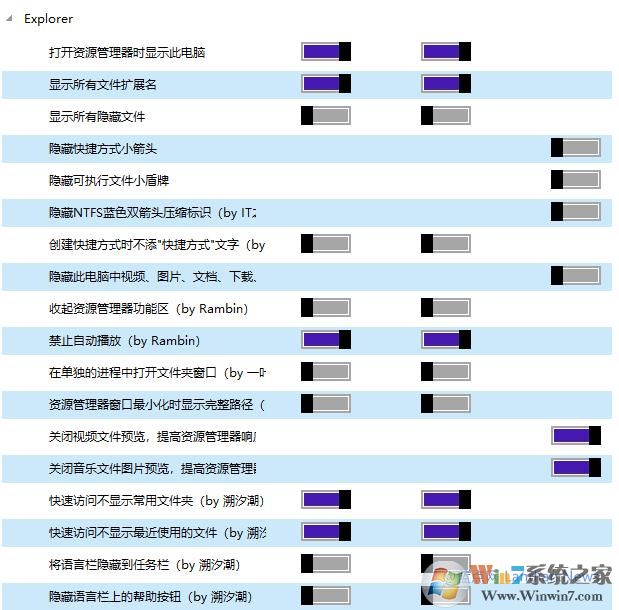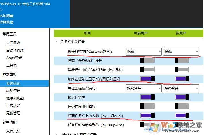 3、这里隐藏了任务栏的Cortana、不折叠任务栏图标通知、隐藏了任务栏人脉按钮等,都是一些外观的设置;