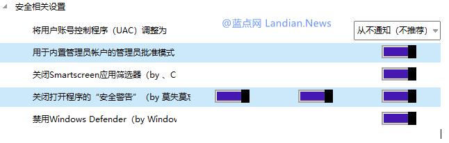 5、这些设置可以加快系统响应速度,内置管理员账户的管理员批准模式可以解决用administrator账户无法使用磁贴应用的问题