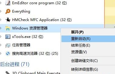 1、可先尝试通过Ctrl+Alt+Del调用“任务管理器”,进入任务管理器后右击资源管理器并选择“重新启动”(图1)。若桌面未能恢复正常,再重启电脑看是否能够恢复。