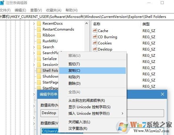 2、若还是存在问题无法解决的话继续往下看。按拿下win+R打开运行,运行键入:REGEDIT命令进入注册表编辑器,依次定位到“HKEY_CURRENT_USER\Software\Microsoft\Windows\CurrentVersion\Explorer\Shell Folders”,在右侧窗格中找到Desktop字符串值,双击该值并把“数值数据”中的路径复制起来;