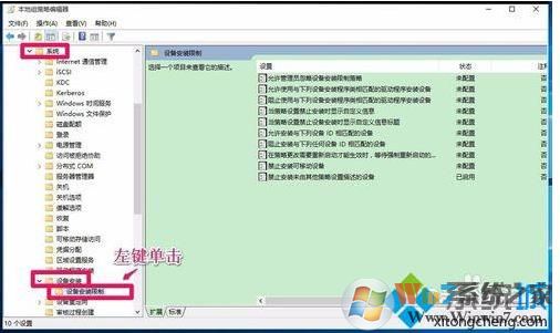 3、我们在系统的展开项中找到设备安装 - 设备安装限制,并左键单击:设备安装限制。