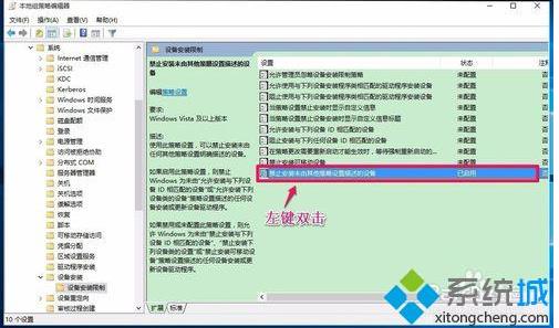 4、在设备安装限制对应的右侧窗口,找到并左键双击:禁止安装未由其他策略设置描述的设备。