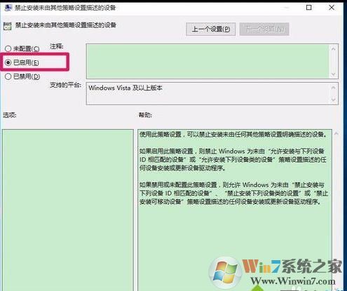 5、在打开的禁止安装未由其他策略设置描述的设备窗口,可以看到禁止安装未由其他策略设置描述的设备其选项为“已启用”。