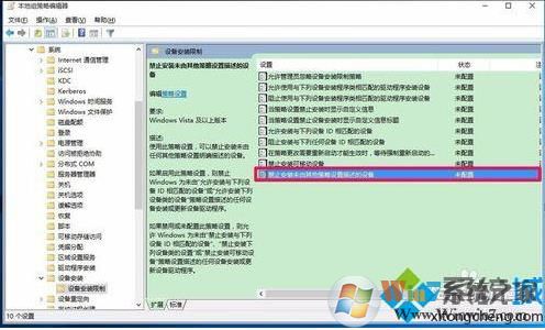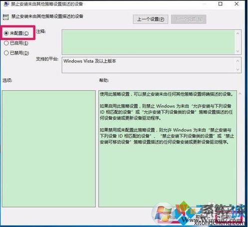 8、我们点击应用-确定以后,在本地组策略编辑器中,禁止安装未由其他策略设置描述的设备选项为“未配置”,退出本地组策略编辑器。