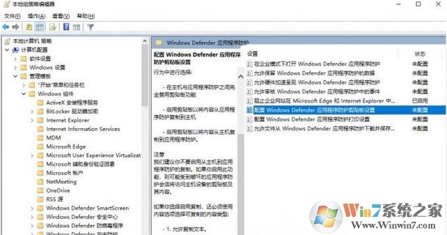 4、在搜索框输入“gpedit.msc”启动组策略编辑器,依次定位到“计算机配置→管理模板→windows组件→Windows Defender应用程序防护”,然后双击右侧的“配置Windows Defender应用程序防护剪贴板设置”,如图: