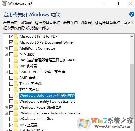 2、在搜索框输入“启用或关闭Windows功能”,在打开的窗口勾选其中的“Windows Defender应用应用程序防护”,点击“确定”按提示开启该组件该组件的支持,重启系统后就可以使用WDGA组件来保护系统了,如图: