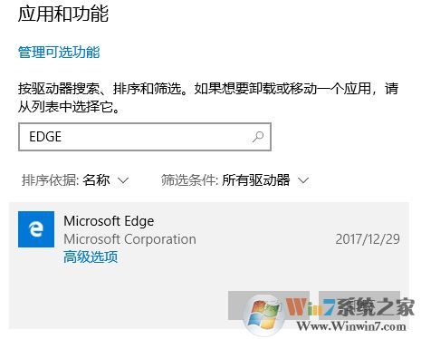 3、列表中找 Edge,点击高级选项。进入高级选项之后请尝试重置浏览器,如图所示: