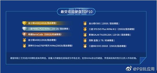 最受欢迎的十款硬盘中,大容量、NVMe也成为流行趋势。拔得头筹的是高性价比的金士顿A400 240GB,类似的A400 120GB、V300 120GB也都上榜。