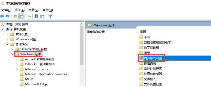 2. 在组策略编辑器的左侧窗格中找到“计算机配置-管理模板-windows组件-同步你的设置”;