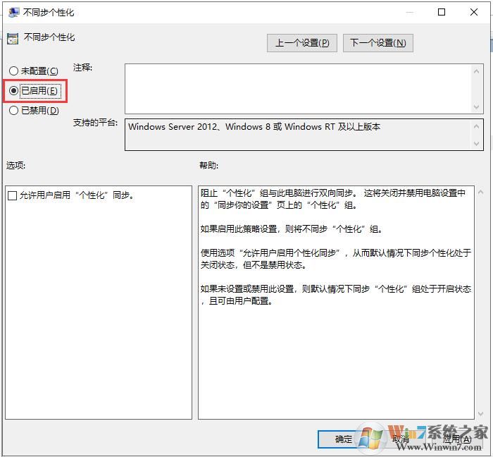 4. 双击打开这些设置,调整为“已启用”保存,这时设置项被设置为不同步,之后则不会在此电脑上同步这些选项;