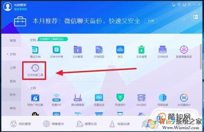 3、最大化后单击屏幕左侧的“文档”后单击第二行的“文件恢复工具”。(如果你之前没有用过这个软件,需要下载的。保持良好的网络状态)