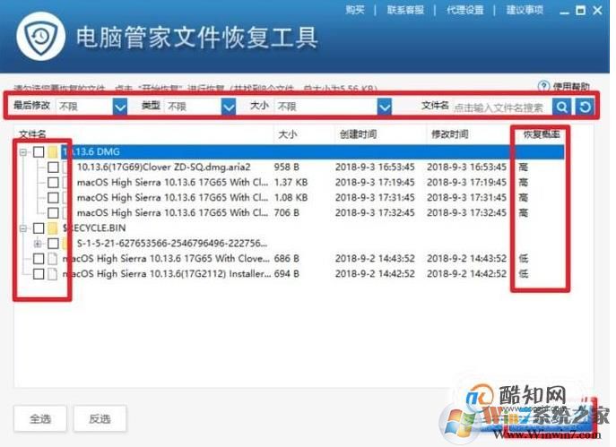 6、你可以在窗口上方按自己的要求选择“删除日期,类型,大小和文件名”这样效率比较高。“勾选”你要恢复的文或文件夹后单击“开始恢复”即可。