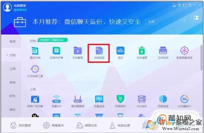 1、同样的方法打开“电脑管家”的“工具箱”。单击“找回文档”工具。(这个功能是自带的不需要下载。)