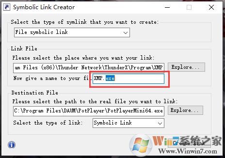 3、下载我提供的这个创建软链接(Symbolic Link)、硬链接(Hard Link)的小工具,把你的Potplayer,MPC或者VLC链接到这个文件夹里面生成一个名为“XMP.exe”的软链接或者硬链接。具体操作如下图示