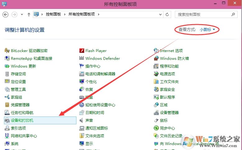 2、将查看类型更改为小图标,然后点击“设备和打印机”;