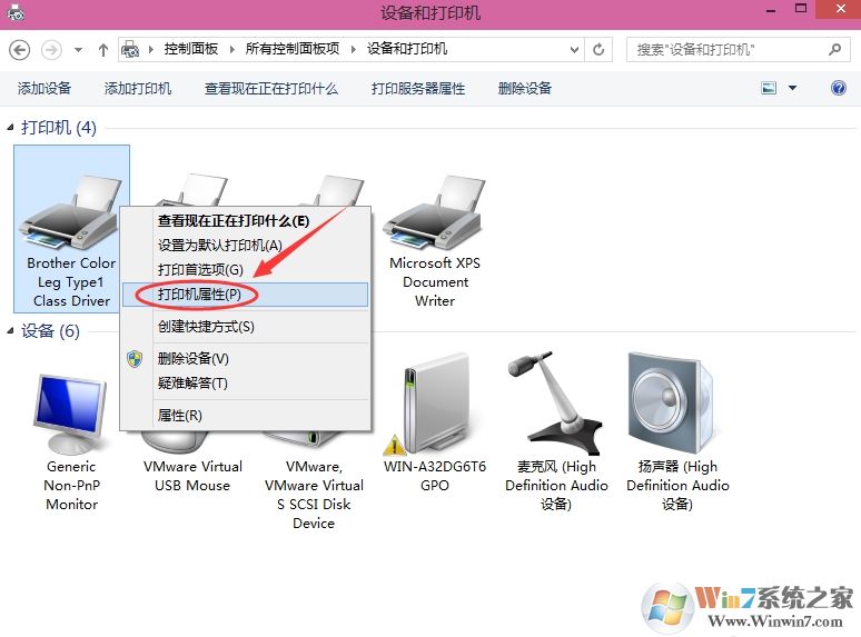 3、在设备和打印机窗口中,选择一台你想要共享的打印机,然后在右键选择“打印机属性”;
