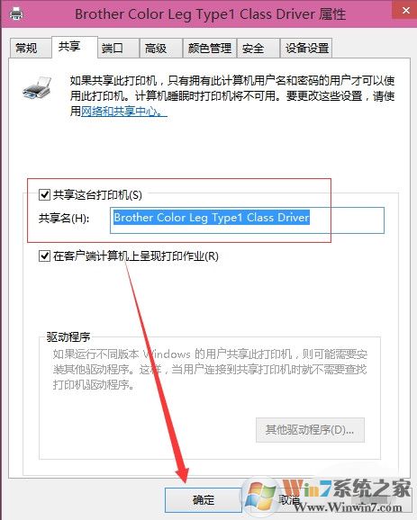 5、在共享选项卡里将“共享这台打印机”勾选上,然后点击“确定”。