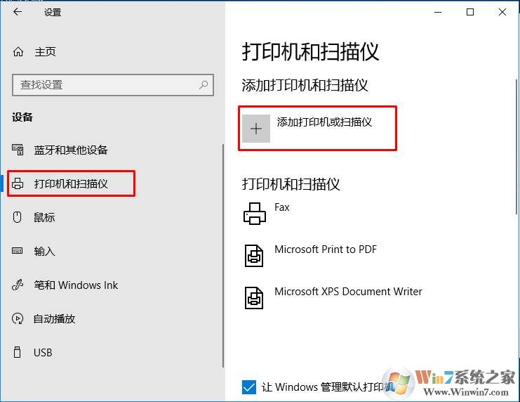 2、选择打印机和扫描仪,然后在右侧点击添加打印机或扫描仪;